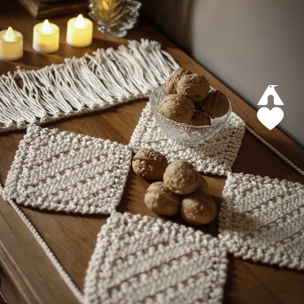 Um caminho de mesa diferentão, feito com o fio Ateliê Natureza (100% algodão), que tem uma cartela inspirada na natureza e entrega aquele toque rústico elegante que a decoração contemporânea ama. Além do caminho de mesa, você também vai aprender a receita dos apoios de copos combinando, detalhe que protege a peça e deixa a mesa ainda mais bonita.