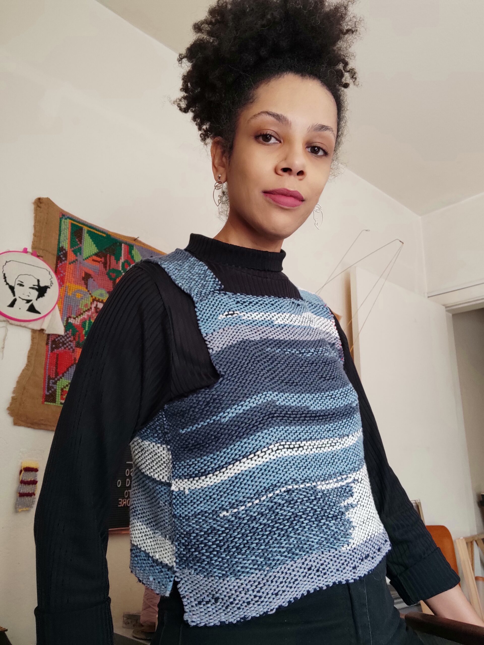 Tecida e finalizada as duas peças, junte pelo lado direito frente e costas, costure as laterais e os ombros. Para arrematar os fios, usamos a agulha escondendo entre as tramas.