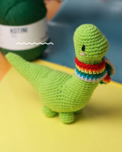 Que tal unir dinossauro + amigurumi! A artesã Karina Mie criou “amigurumisaurus” com um fofo cachecol rainbow em homenagem ao orgulho LGBTQIAP+ ! Confira o passo a passo desse Dinossauro de crochê muito divertido e de uma fofura incrível, pois foi feito com KOTINI, nosso fio 100% acrílico com uam torção perfeita.