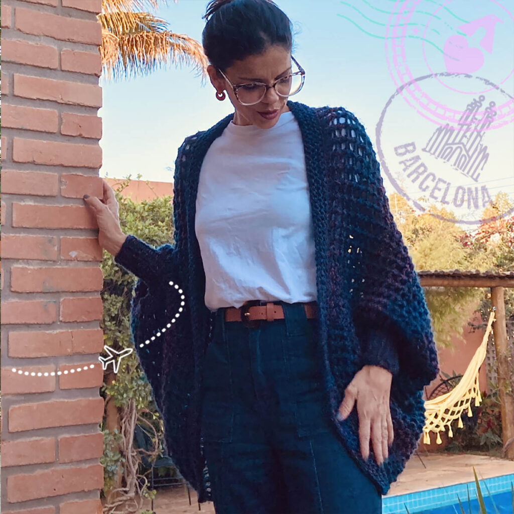 Aqui ele é apresentado na técnica Knooking em que tecemos os pontos do tricô usando uma agulha de crochê. Mas assistindo à vídeo aula, nada te impede de executar a receita em tricô ou adaptar a lógica da construção do Kimono para o crochê com um ponto da sua preferência.