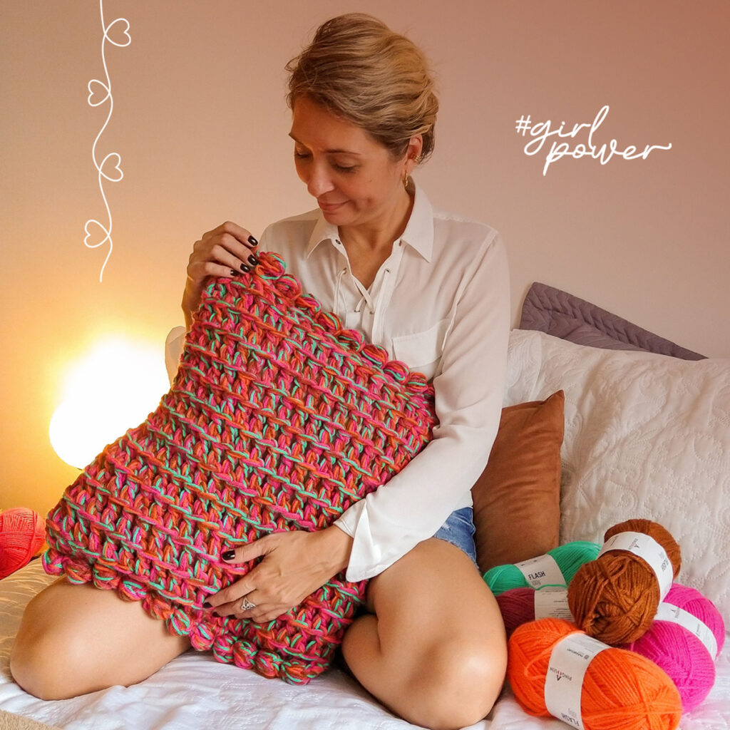 Ela mesclou TODAS as cores de uma vez só trabalhando com 5 cabos simultâneos, com uma agulha de espessura mais grossa, o que resultou um efeito diferente e incrível. Separe seus novelos e uma agulha para crochê nº 12mm e crochete conosco!