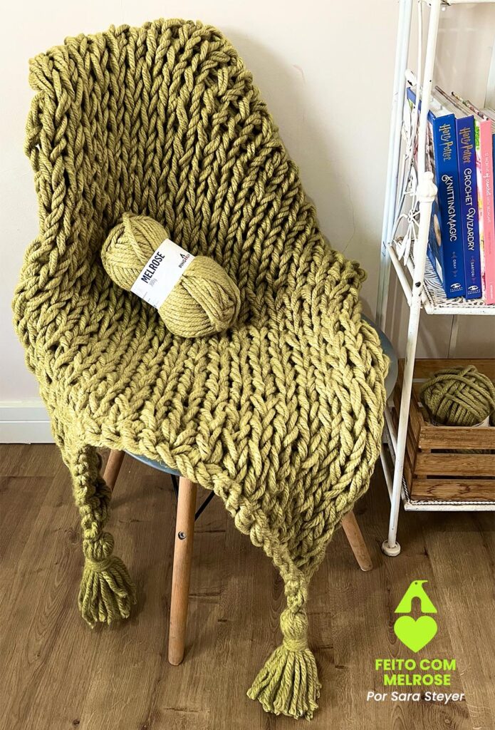 Acesse o passo a passo da manta em maxi tricô de dedo aqui.